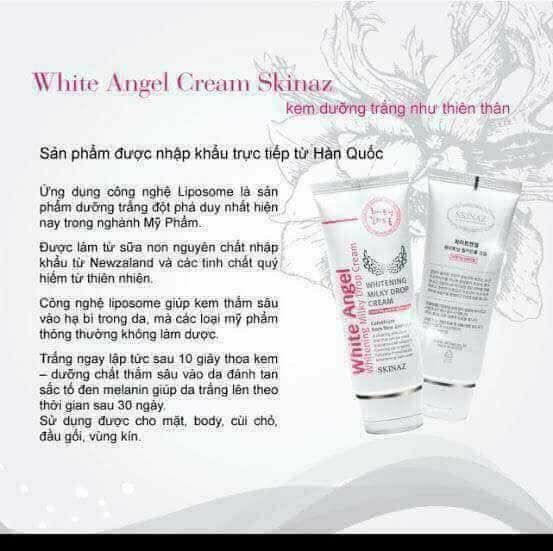 Kem White Angel Skinaz Hàn Quốc được chiết xuất từ thành phần sữa non tự nhiên, nguồn sữa non nguyên chất được lấy từ Newzeland sở hữu vô số tính năng đặc biệt: dưỡng trắng, dưỡng ẩm, mịn da, se khít lỗ chân lông và chống lão hóa, mờ nám tàn nhang đã khiến white Angel Skinaz trở thành cơn sốt trong việc chăm sóc da an toàn tại Việt Nam.