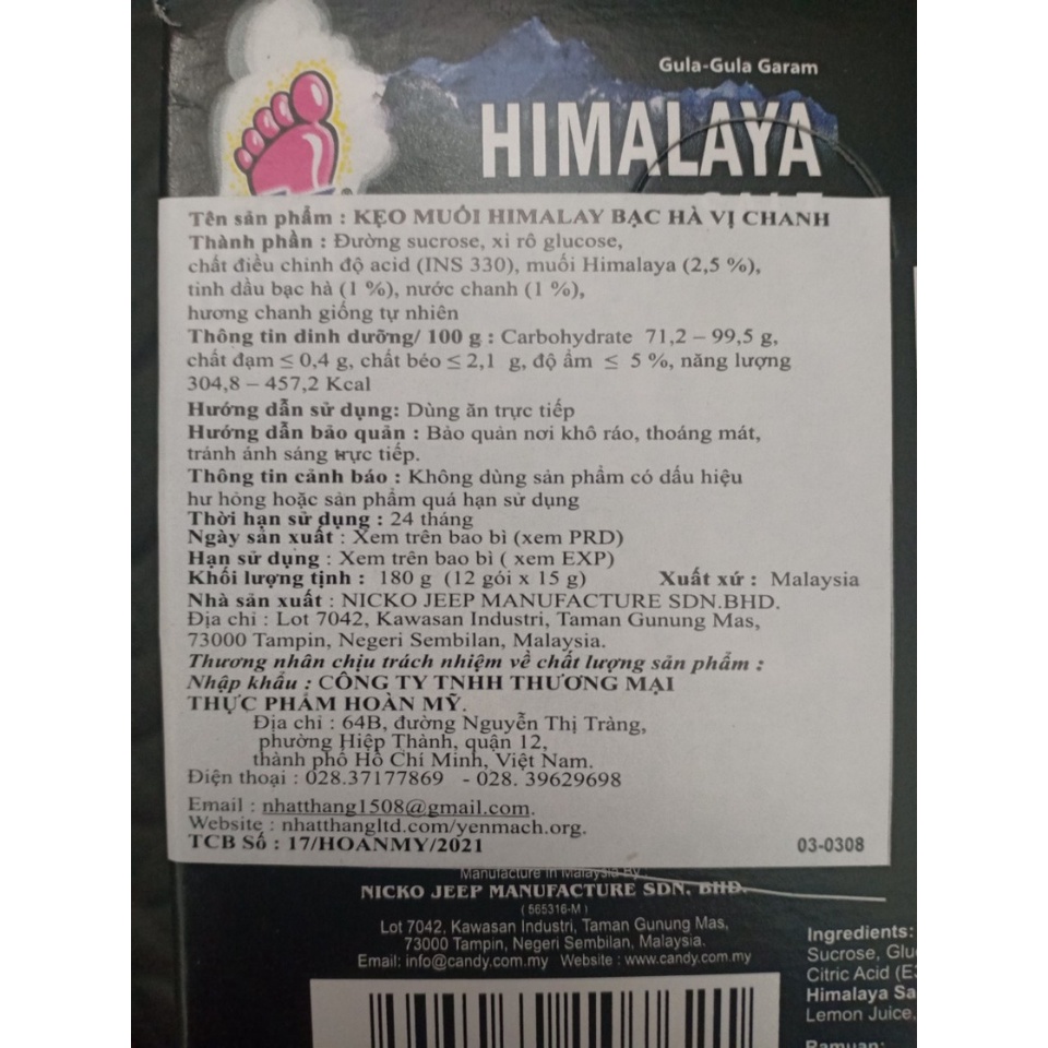 MÔ TẢ SẢN PHẨM Kẹo Chanh Muối Himalaya Vị Bạc Hà 180g với hương vị hấp dẫn, giúp bổ sung năng lượng và chất dinh dưỡng. Sản phẩm không chứa đường hóa học, không sử dụng các hóa chất độc hại đảm bảo an toàn cho người sử dụng. Được sản xuất theo công nghệ hiện đại, mọi khâu từ tuyển chọn nguyên liệu tới chế biến đều diễn ra khép kín dưới sự giám sát và kiểm tra nghiêm ngặt. Sản phẩm là sự lựa chọn hoàn hảo để làm đồ ăn vặt cho gia đình mình. HẠN SỬ DỤNG: 24 THÁNG XUẤT XỨ: MALAYSIA NHÀ SẢN XUẤT: NICKO JEEP MANUFACTURE SDN BHD ĐC: Lot 7042, Kawasan Industri, Taman gunnung Mas, 7300 tampin, Negeri, sembilan, Malaysia NHẬP KHẨU BỞI: CTY TNHH THƯƠNG MẠI THỰC PHẨM HOÀN MỸ ĐC: 64B, Nguyễn Thị Tràng, P Hiệp Thành, Q 12, TPHCM