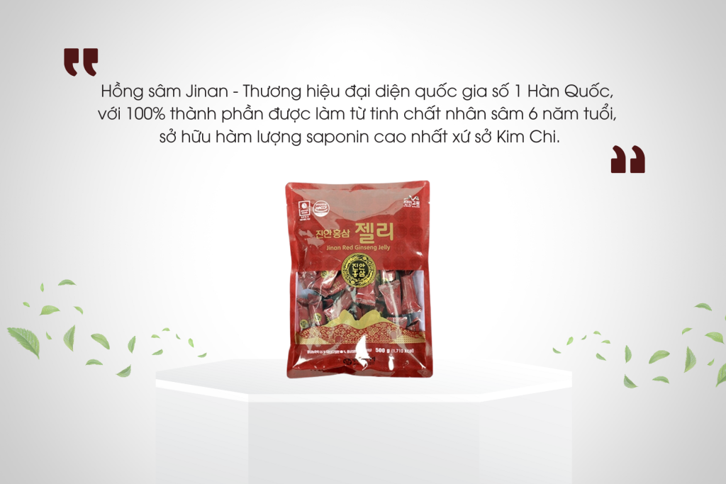 – Là sản phẩm kẹo dẻo hồng sâm đặc biệt, giữ trọn hương vị và mùi thơm đặc trưng của những củ hồng sâm đến từ cao nguyên Jinan – cao nguyên duy nhất của Hàn Quốc, mang lại cảm giác yêu thích cho mọi người khi dùng, từng viên kẹo dai dai, dẻo dẻo, thơm mát lan toả trong khoang miệng khiến bất cứ ai đã ăn là sẽ nghiền.