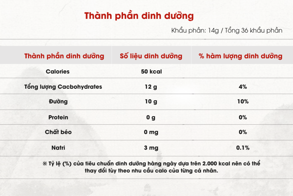 Thành phần | Đường mạch nha, đường tinh chế, bột Oblate (tinh bột khoai tây, tinh bột ngô, lecithin đậu nành), Chiết xuất hồng sâm 0.5% (Hàn Quốc/ Thành phần chất rắn 60%, thành phần hồng sâm trên 70mg/g ), muối tinh chế, màu caramel, hương liệu tổng hợp (hương hồng sâm, hương thảo mộc), chất nhũ hóa, L-menthol, chứa đậu nành. |