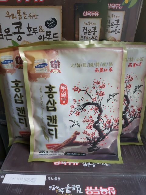 ----------------------------------------------------------- Kẹo Sâm Không Đường Cành ĐàoHàn Quốc Xuất xứ : Korea Hàn Quốc Quy cách : Gói 200gr