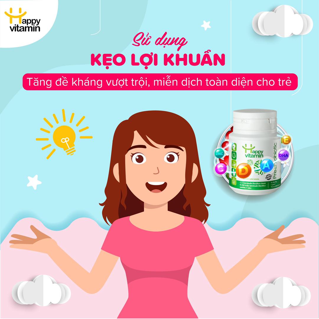 + Happy Vitamin Lutein Probiotic hỗ trợ các vấn đề về đường tiêu hóa dưới dạng kẹo ngậm.