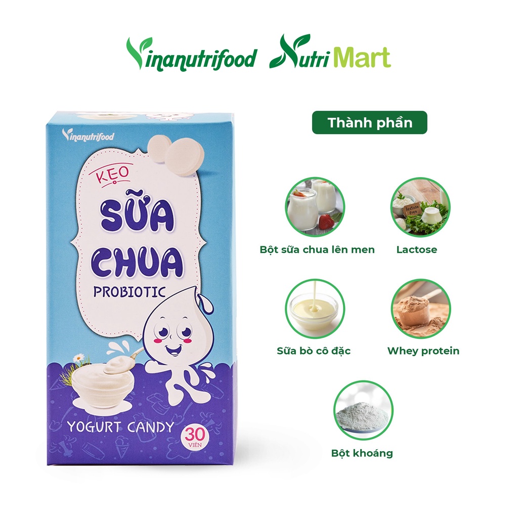 THÀNH PHẦN Trong mỗi hộp kẹo sữa chua Probiotic có chứa 30 viên, mỗi viên bao gồm : Sữa bò cô đặc 35%, Bột sữa chua lên men 10%, Whey Protein 5%, Amylase 2%, Protease 3,5%, Lipase 2%, Lactosea 3,2%, Cellulase 2,6%, Bột khoáng tổng hợp 5%, Maltodextrin, Dextrose monohydrate, đường isomalt vừa đủ 1 viên Bột khoáng tổng hợp: Canxi 15%, magie 5%, kẽm 5%, lactose vừa đủ Sản phẩm chứa sữa.