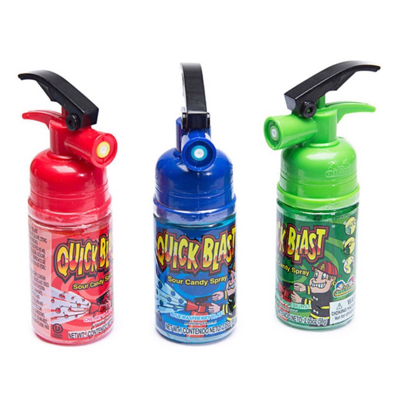 Kẹo xịt nước trái cây hình bình cứu hỏa vị chua với ba mùi: táo, dâu và mâm xôi.