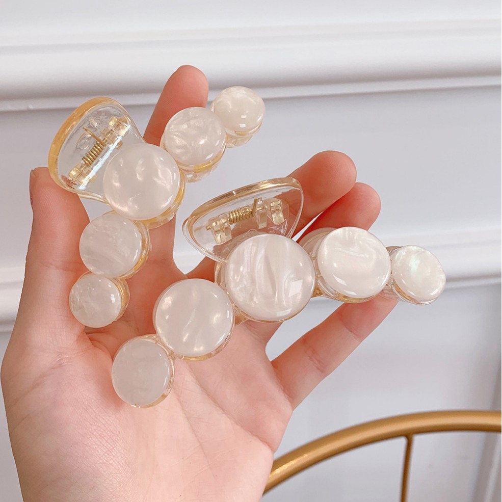 Chất liệu: phần kẹp được làm từ nhựa cứng, trang trí bởi những hạt tròn trắng sáng, bắt mắt. Màu sắc: vàng trong Kích thước: +Size S: khoảng 3cm +Size M: 7cm +Size L: 8.5cm +Size XL: 10cm