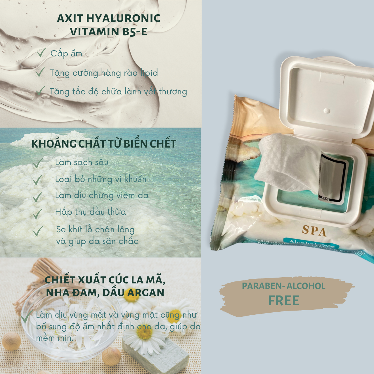 Khăn giấy tẩy trang 30 Eye & Face Make-up Remover Wipes - Health and Beauty được làm giàu với khoáng chất biển Chết, pro-vitamin B5, vitamin E, axit hyaluronic, chiết xuất các loại thực vật như Nha đam, dầu hạt Argan và hoa cúc La Mã có tác dụng làm dịu vùng mắt và vùng mặt cũng như bổ sung độ ẩm nhất định cho da, giúp da mềm mịn.