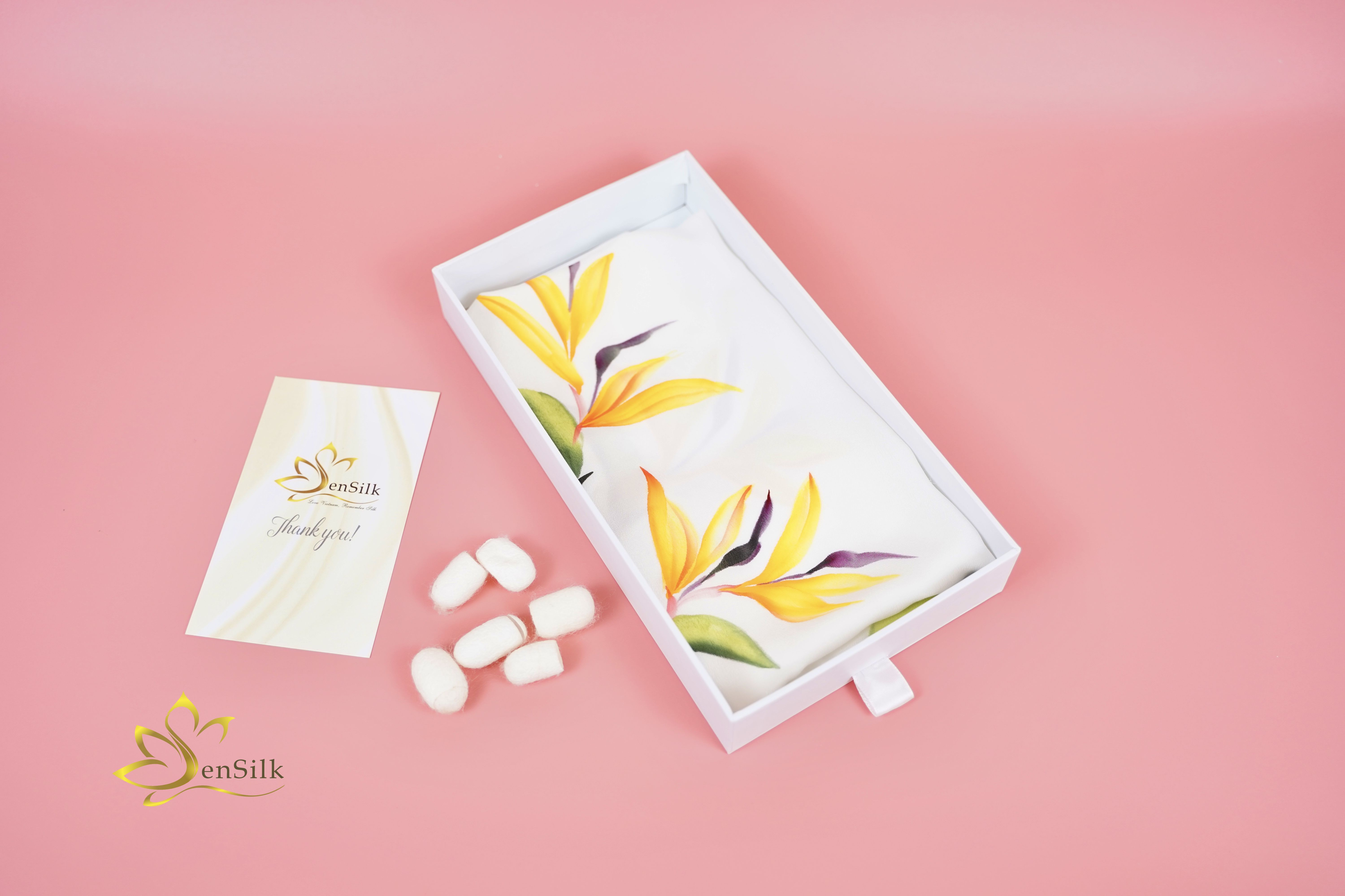 Đặc biệt, khăn lụa vuông vẽ tay SenSilk Luxury là dòng sản phẩm từ lụa 100% tơ tằm Bảo Lộc – nơi được mệnh danh “Thủ phủ dâu tằm tơ Việt Nam” từ lâu đã nổi tiếng với nghề trồng dâu, nuôi tằm và dệt lụa. Gam màu trang nhã dễ kết hợp với mọi trang phục chính là lựa chọn dành cho quý cô yêu phong cách tối giản và thanh lịch.
