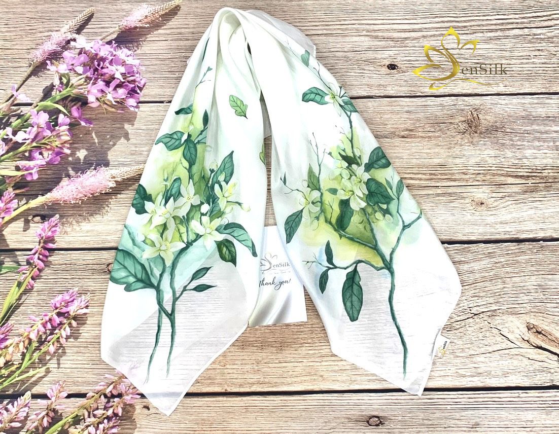 Khăn Lụa ĐẹpVẽ Hoa Bưởi SenSilk – là biểu tượng của sự thật thà, còn trong tình yêu hoa tượng trưng cho một tình yêu trong sáng. Ai lại không ngỡ ngàng trước sắc trắng tinh khôi của những chùm hoa bưởi tròn tròn, ý nhị với 5 cánh cong cong và những ánh nhụy vàng ươm như nụ cười duyên dáng.