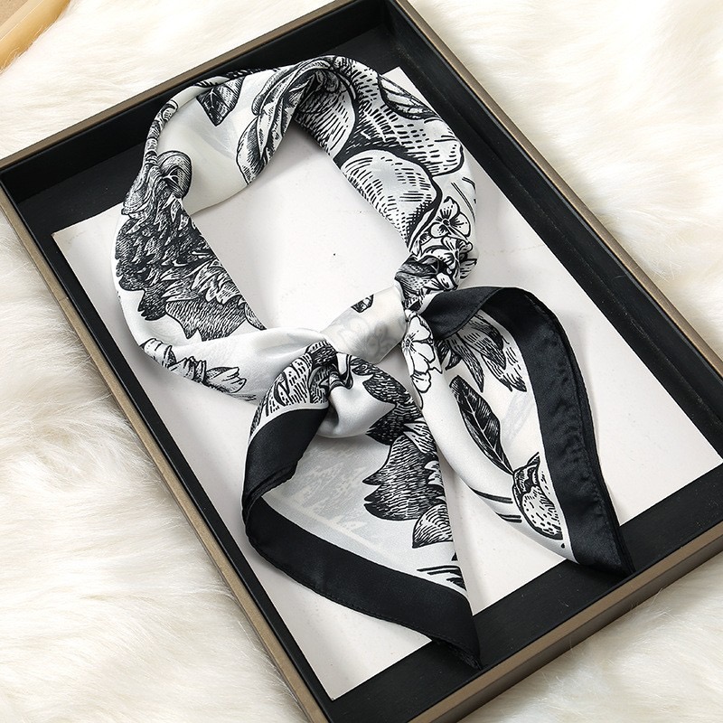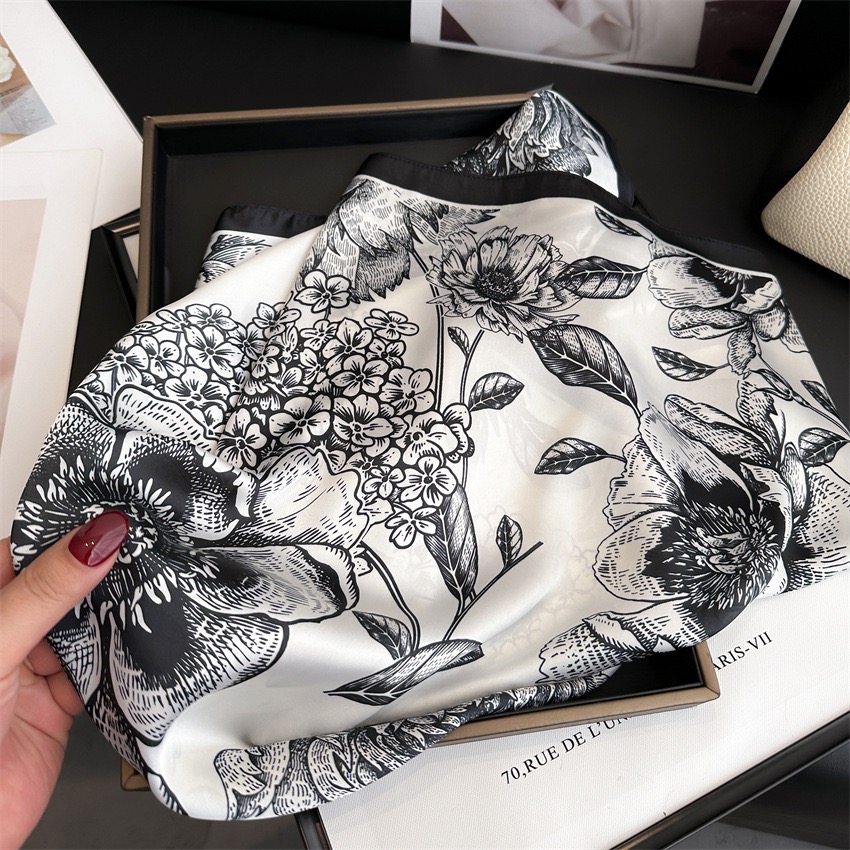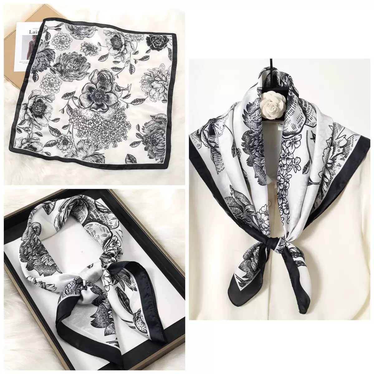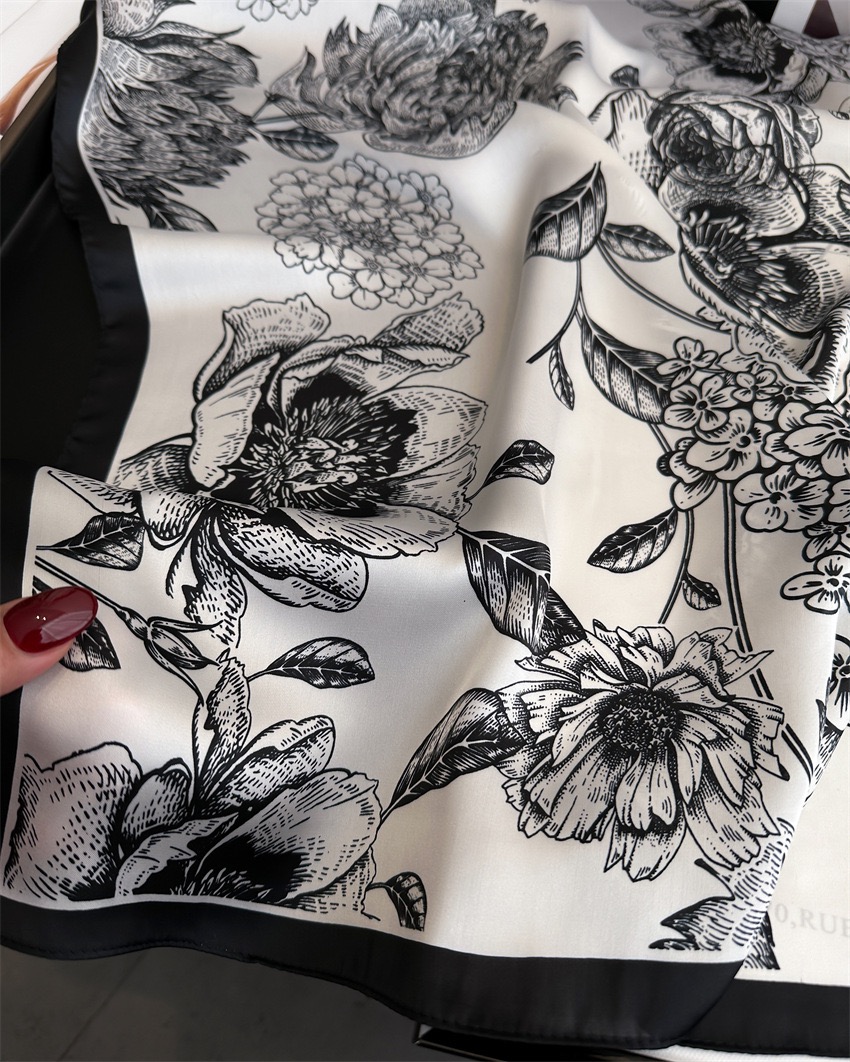 2. Thiết kế : Khăn quàng cổ hình vuông nhỏ. Phong cách phù hợp tất cả. Hoạ tiết hoa đen sang trọng