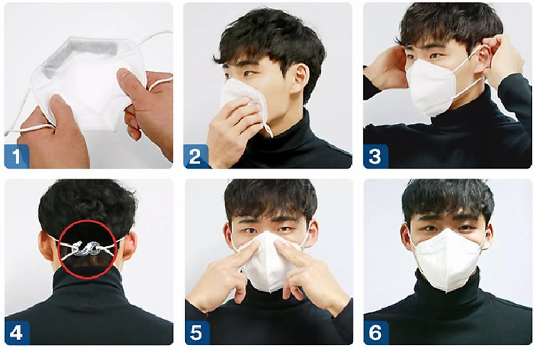 Bước 4. Dùng hai tay che phủ toàn bộ khẩu trang. Thở mạnh ra, nếu có không khí thoát ra bên ngoài thì phải điều chỉnh lại thanh kim loại, dây đeo qua tai và sau đó kiểm tra độ khít. Nếu khẩu trang vẫn không khít với mặt, không được vào khu vực nguy hiểm.