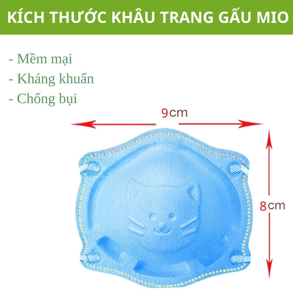 Khẩu Trang Cho Em Bé 3D MIO MASK (Set 3 Chiếc) Khẩu Trang Con Gấu Có Thể Dùng Cho Em Bé Sơ Sinh Đến 3 Tuổi Ba mẹ tham khảo kích thước để chọn phù hợp cho bé nhé, vì nhiều bé mặt to, mặt nhỏ khác nhau ạ ✔️Thương hiệu: MIO MASK ✔️Quy cách đóng gói: 3 chiếc ✔️Màu sắc: Trắng * Quai đeo có núm điều chỉnh phù hợp kích cỡ mặt bé nha. * Khẩu trang trẻ em hình gấu được làm từ chất liệu bông hoạt tính, đã qua khử trùng nghiêm ngặt, không chứa các loại hoá chất độc hại cho trẻ nhỏ, giúp chống bụi và các nguồn bệnh lây nhiễm. * Với thiết kế dạng vòm 3D, tạo không gian xung quanh mũi và miệng giúp bé thở dễ dàng, không bị ngạt, không khó chịu. * Viền bao ngoài ôm sát mũi và miệng bé, ngăn không cho bụi bẩn đi vào. Đặc biệt là, vì ôm khít vừa phải vào miệng nên sẽ không bị tình trạng Khẩu trang che phải mắt của bé như các loại Khẩu trang thông thường khác. * Khẩu trang trẻ em hình gấu có dây đeo rất mềm mại, không làm bé bị đau tai và khó chịu khi đeo. * Các mẹ có thể giặt nhẹ và tái sử dụng được ạ