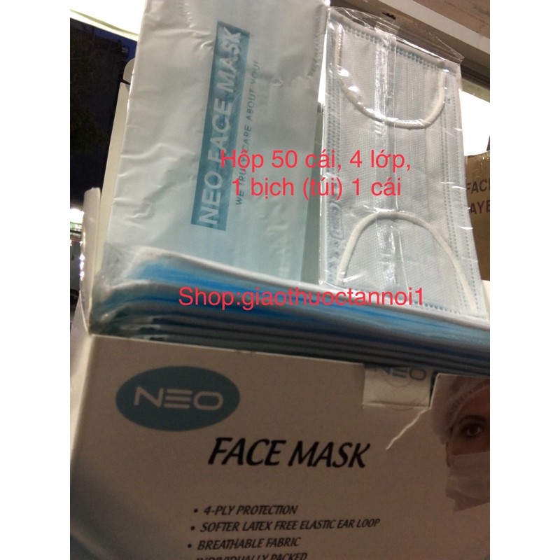 Khẩu trang face mask NEO - hộp 50 cái, 1 bịch (túi ) 1 cái, 4 lớp (sản phẩm do cty cổ phần phát triển Neo sản xuất )