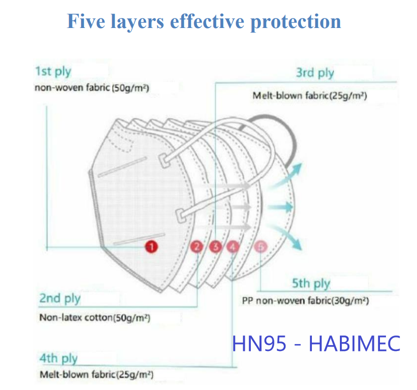 5. Khẩu trang HN95-Habimec gồm 5 lớp kháng khuẩn, có tác dụng ngăn ngừa khói bụi, khí, vi khuẩn xâm nhập. Khả năng lọc các khí H2S, SO2, CO, NH3…và lọc bụi cao hơn khẩu trang thông thường từ 90%, đặc biệt lớp giấy lọc kháng khuẩn được kiểm nghiệm hiệu quả lọc vi khuẩn trên 99%. Sử dụng hiệu quả khi lưu thông trên đường hay làm trong bệnh viện, môi trường công nghiệp độc hại. Đạt chuẩn EN149: 2001+A1:2009 – FFP2 và TCVN 8389-1:2010 và TCVN 7312:2003
