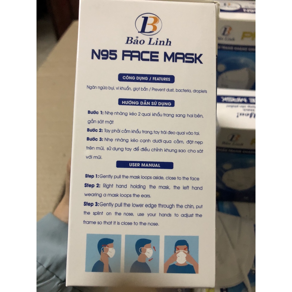📌Khẩu Trang N95 Có Van Thở ✅Thương hiệu: BẢO LINH ✅Tên sản phẩm: Khẩu trang y tế 5 lớp N95 Có Van Thở ✅Xuất xứ: Việt Nam ✅Màu sắc: Trắng ✅Quy cách đóng gói: Hộp 10 chiếc khẩu trang N95 có van thở 📌Thành phần: ✅ Cấu trúc 5 lớp kháng khuẩn theo tiêu chuẩn BFE >=95% ✅ Lớp diệt khuẩn trong khẩu trang – GECIDE FABRIC được kiểm chứng bởi các phòng thí nghiệm uy tín thế giới. ✅ Dây thun đeo tai mềm mại, đàn hồi tốt. ✅ Nẹp mũi kim loại dễ điều chỉnh, ôm trọn khuôn mặt Hướng dẫn sử dụng: ✅ Khẩu trang y tế n95 có thể sử dụng nhiều lần ✅ Ngăn giọt bắn, mầm bệnh qua đường hô hấp ✅ Mở hộp, lấy khẩu trang ra khỏi hộp nhẹ nhàng. Cầm khẩu trang ở mặt ngoài và 2 quai đeo, không tiếp xúc tay vào mặt trong của khẩu trang để tránh làm nhiễm khuẩn mặt trong của khẩu trang. ✅ Đeo hai quai vào 2 bên tại, cố định nẹp cánh mũi ✅ Kéo phần dưới của khẩu trang cho bao xuống hết cằm 📌Hướng dẫn bảo quản khẩu trang: Nơi khô ráo, thoáng mát