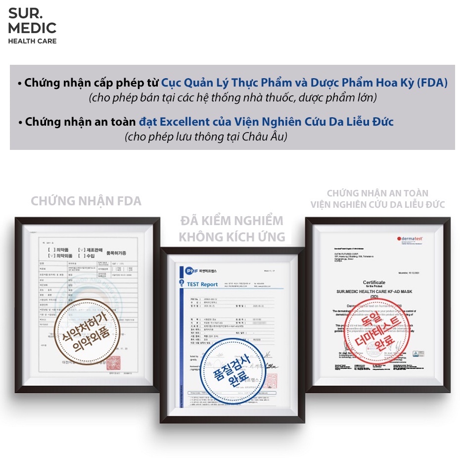 Đây là dòng khẩu trang y tế cao cấp đạt chuẩn được chứng nhận cấp phép từ Cục quản lý Thực phẩm và Dược phẩm Hoa Kỳ (FDA) cho phép bán tại các hệ thống nhà thuốc, dược phẩm lớn. Và thông qua thẩm định - chứng nhận an toàn đạt cấp độ EXCELLENT (xuất sắc / 5 sao) của viện nghiên cứu Da liễu Đức (cho phép lưu thông ở thị trường Châu Âu)