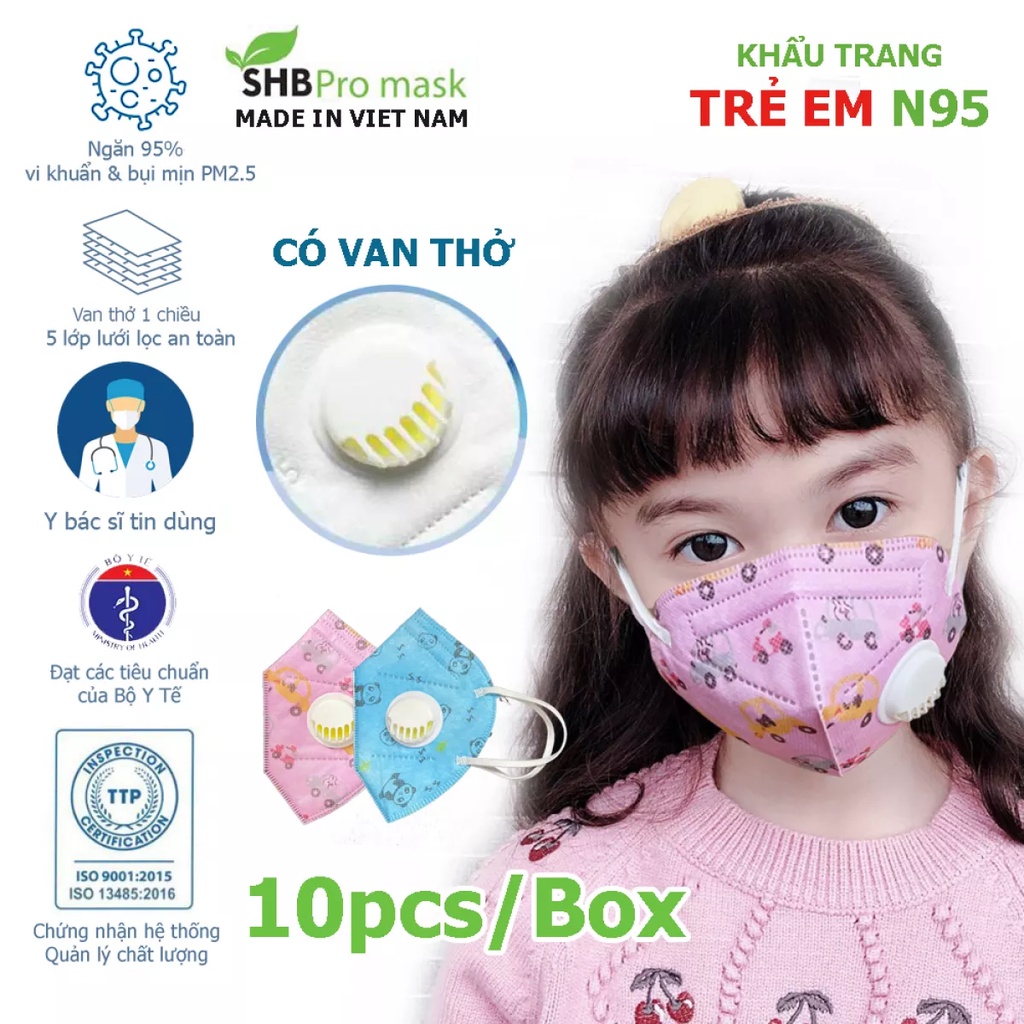 Khẩu Trang SHB Pro Mask N95 Trẻ Em Có Van Hiệu Quả Lọc >95% Bụi Mịn PM2.5 hộp 20 chiếc (Hàng Chuẩn - Chính Hãng)