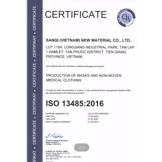 Thành phần: * Lớp ngoài: Vải không dệt Polypropylen. * Lớp giữa: Vải lọc nhập khẩu được chứng nhận bởi Tổ chức Chứng nhận Quốc tế với chỉ số BFE >99%. * Lớp vải kháng khuẩn: Vải kháng khuẩn cao cấp, tăng cường ngăn chặn vi khuẩn xâm nhập từ môi trường. * Lớp trong: Vải không dệt mềm mại, chất lượng cao.