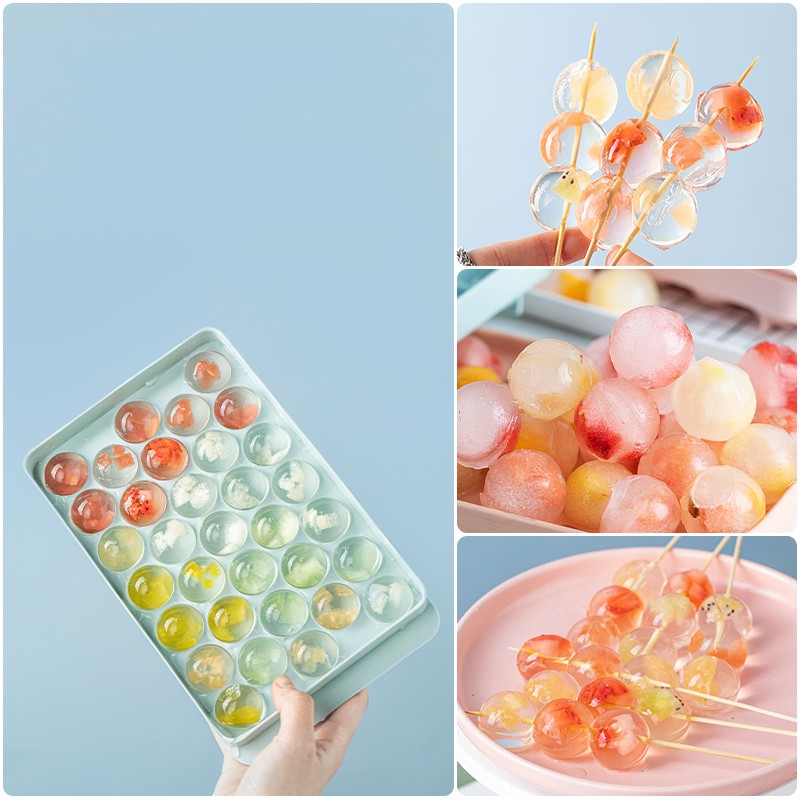 Giới thiệu Khay Làm Đá Tròn 33 Viên Bi Khuôn Làm Đá, Làm Thạch Rau Câu Hoa Quả Có Nắp Đậy Khử Mùi Tủ Lạnh Cao Cấp
