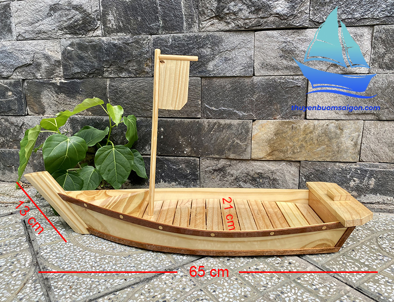 + Khay thuyền gỗ kích thước: Dài 65cm x Rộng 21cm x Cao 15cm (Không tính chiều cao cột buồm). Cột buồm cao 42cm.