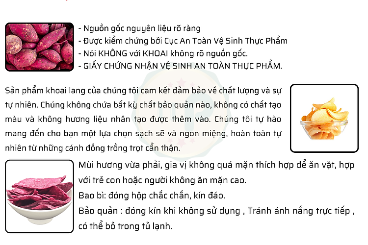 - Hương Vị Tự Nhiên: Sản phẩm giữ nguyên hương vị tự nhiên của khoai lang, không cần sử dụng hương liệu nhân tạo, mang đến trải nghiệm ẩm thực chân thành và tinh tế.