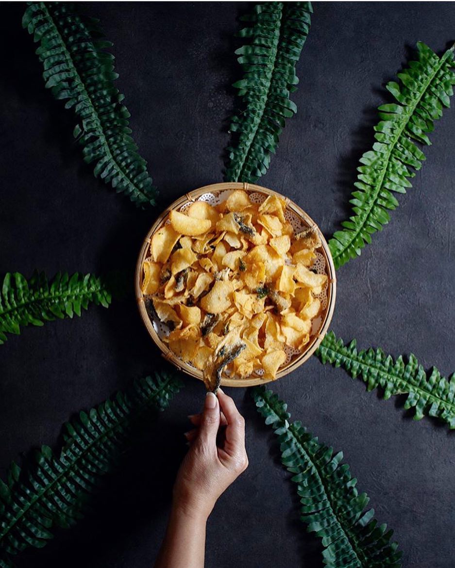 Khoai tây cắt lát mỏng được chiên vàng giòn, trộn với lòng đỏ trứng muối thật thơm, lá cà ri thơm và ớt sừng đỏ rực, cảm giác giòn rụm, cay the và vị trứng muối béo ngậy khó cưỡng