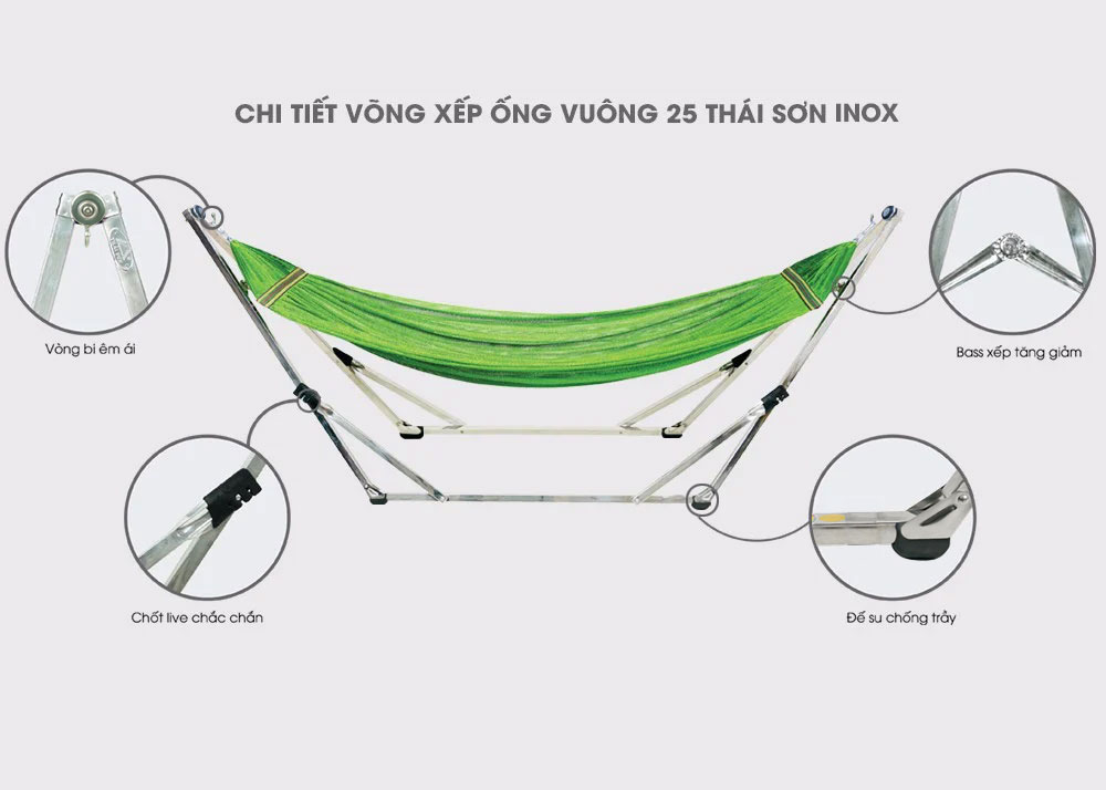 - Võng inox 25 được thiết kế vuông các ống - độc đáo và mới lạ tạo cảm giác dễ chịu, an toàn khi sử dụng.