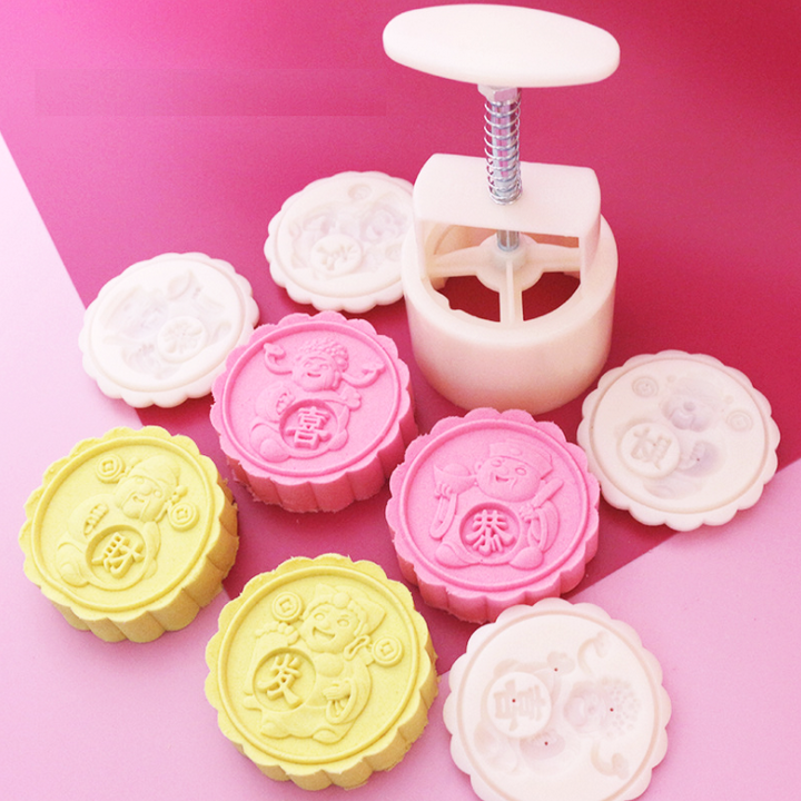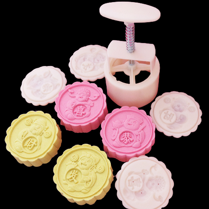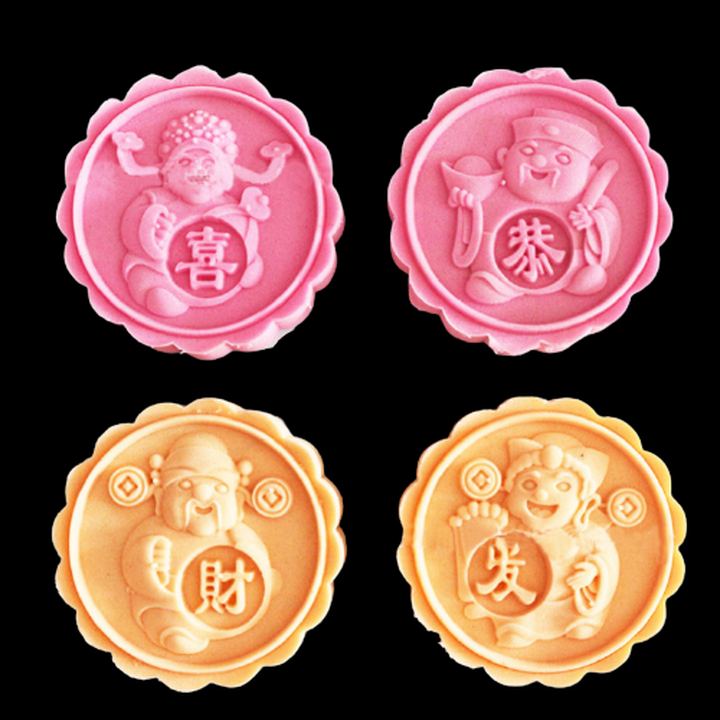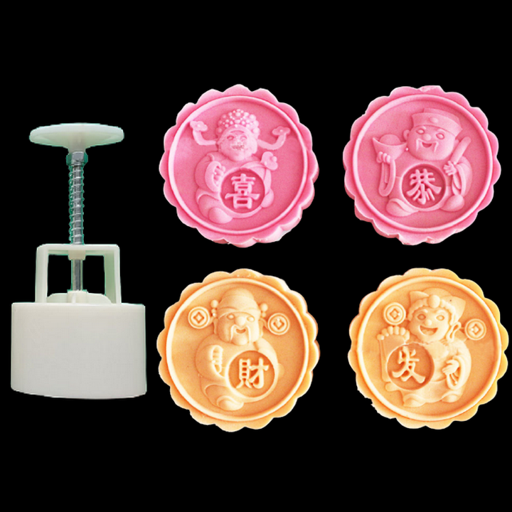 Khuôn trung thu lò xo, khuôn ép xôi 4 mặt tròn Thần Tài cung hỷ phát tài – Mã số 1113