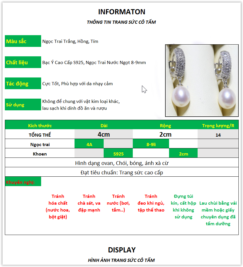 Tất cả sản phẩm đều được kiểm định tại Tổng Hội Địa Chất Việt Nam theo lô về chất lượng bạc ý S925, vàng 18k và Ngọc Trai thật. Đối với những sản phẩm trên 2 triệu sẽ có giấy kiểm định đi kèm với sản phẩm.