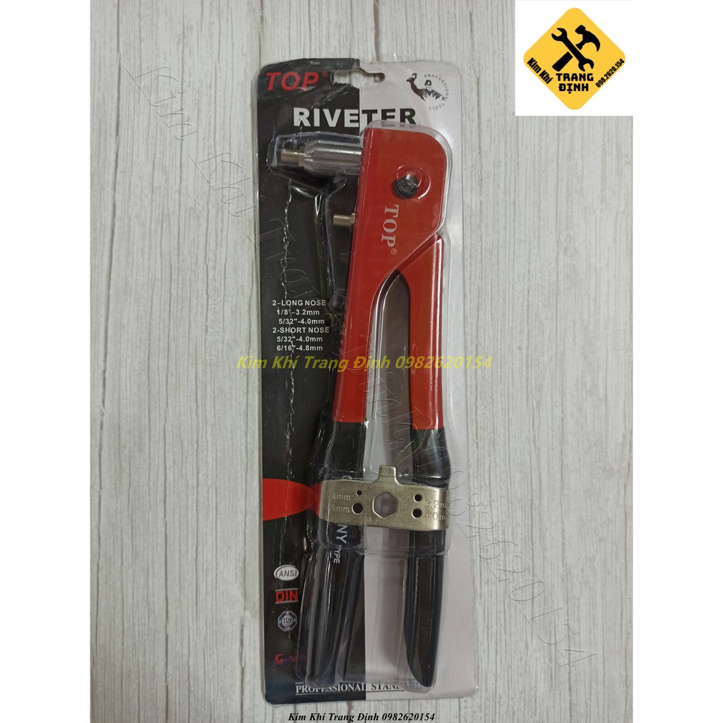 Kìm rút tán đinh rive là dụng cụ khá phổ biến đối với những người thợ chuyên thi công, lắp đặt cửa nhôm, và các thợ lắp ráp tủ sắt… Kìm rút tán đinh rive hiệu TOP, ngoài công dụng rút được đinh rive bằng nhôm, loại kìm này còn có khả năng rút được đinh rive inox. Thân kìm được chế tạo bằng thép, chịu lực tốt, và được phủ lớp sơn tĩnh điện màu cam ,chống gỉ sét trong thật cứng cáp và đẹp mắt Bộ nhíp rút đinh của kìm được chế tạo bằng thép CR-V, và được qua quá trình xử lý nhiệt, nhằm tăng độ cứng cho bộ nhíp Cán kìm được bọc nhựa cao cấp, chống trượt, và giúp thao tác êm tay khi dùng lực mạnh Phụ kiện đi kèm gồm: o 4 đầu rút đinh với các size: 3.2mm, 4mm( 1ngắn, 1 dài), 4.8mm o 1 khóa để mở xiết mở các đầu rút và là chốt khóa giữ cán