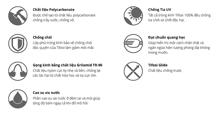 Thiết kế nhẹ và bền chắc của Salvo đảm bảo sự thoải mái cả ngày. Tròng kính polycarbonate chống vỡ cùng khả năng bảo vệ 100% tia UVA / UVB và đạt chuẩn quang học cho bạn độ rõ nét tối ưu. Công nghệ Tifosi Glide của Salvo mang đến sự thoải mái và chống nảy cho mọi hoạt động. Hoạt động cả ngày cùng Salvo!