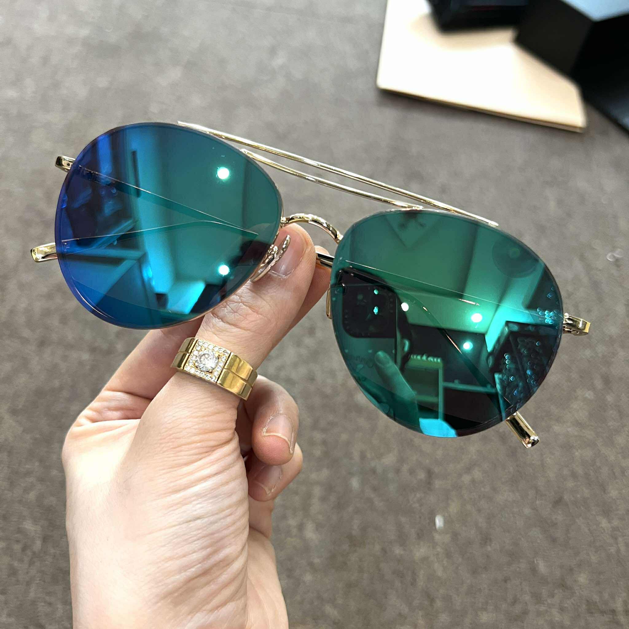 Kính mát thời trang chống nắng dáng nhỏ kim loại cao cấp màu xanh gương