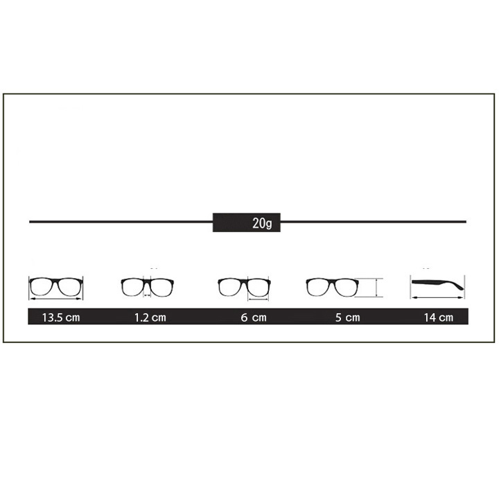 - Kích thước Kính: Ngang: 13.5cm, khoảng cách 2 mắt: 1.2cm, mắt ngang: 6cm, mắt dọc: 5cm, Chiều dài Gọng: 14cm