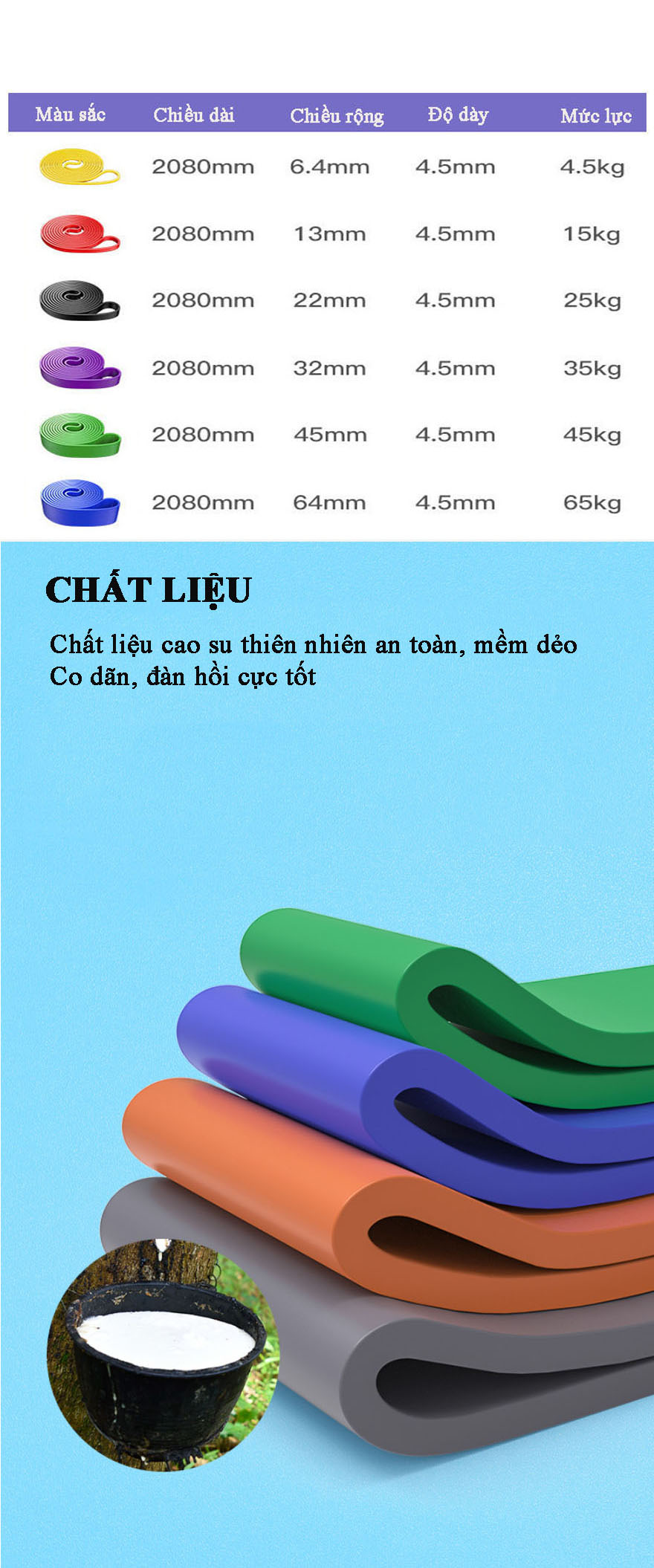 + Dây màu tím 85lbs (độ kháng lực 35kg): Sử dụng cho các bài tập tay, vai, ngực,lưng, xô, mông đùi