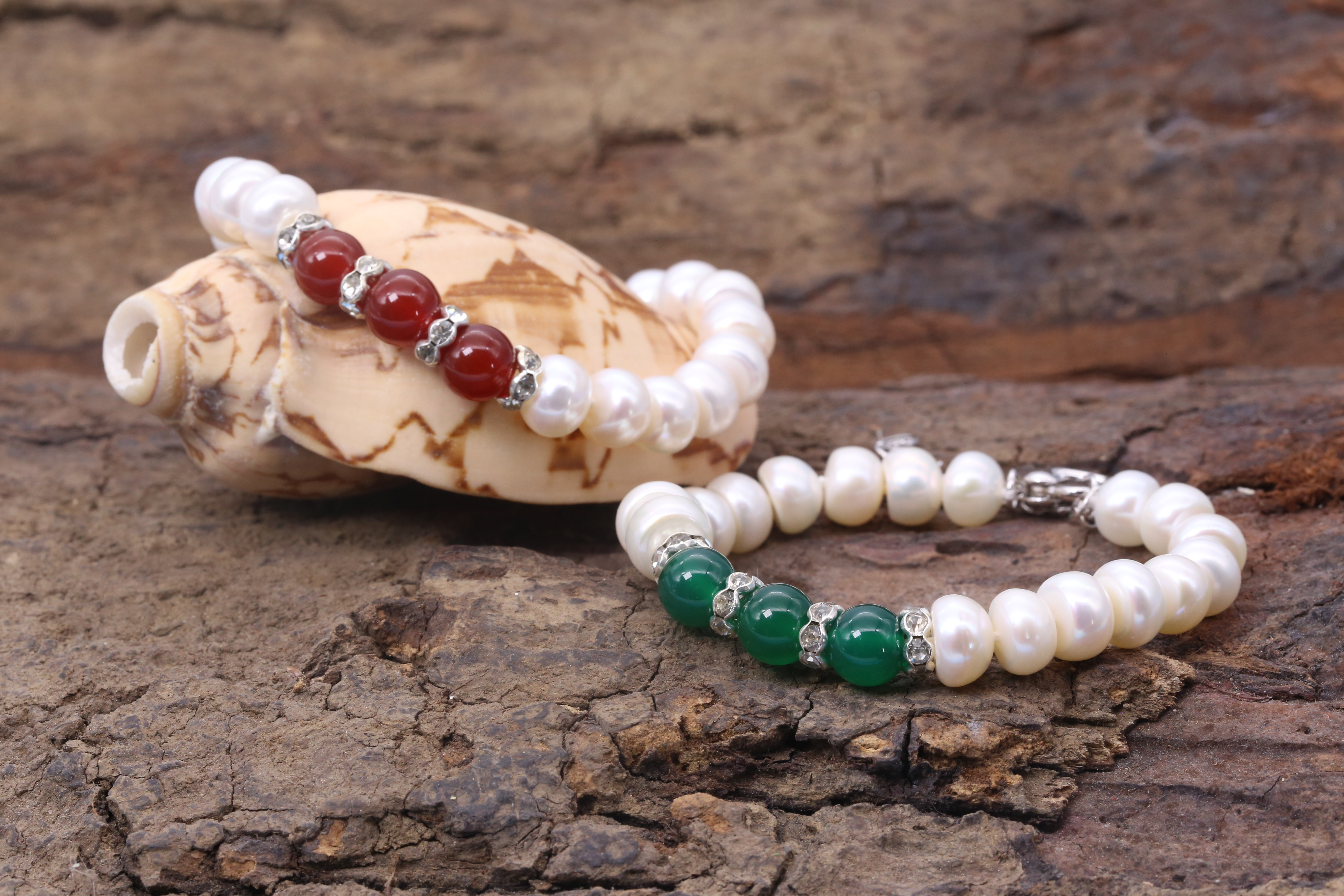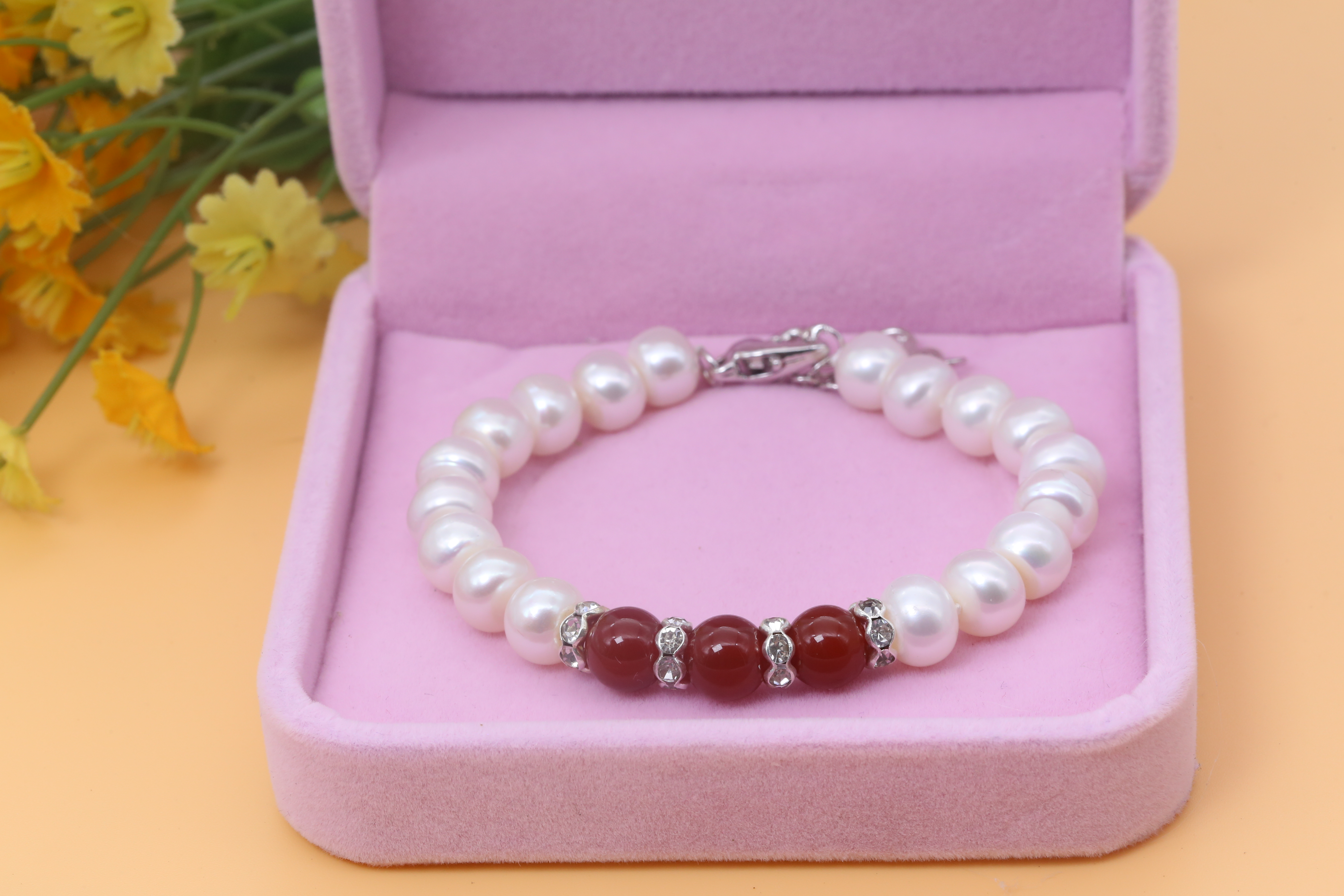 Màu sắc: Ngọc trai trắng kết hợp đá mã não đỏ hoặc xanh