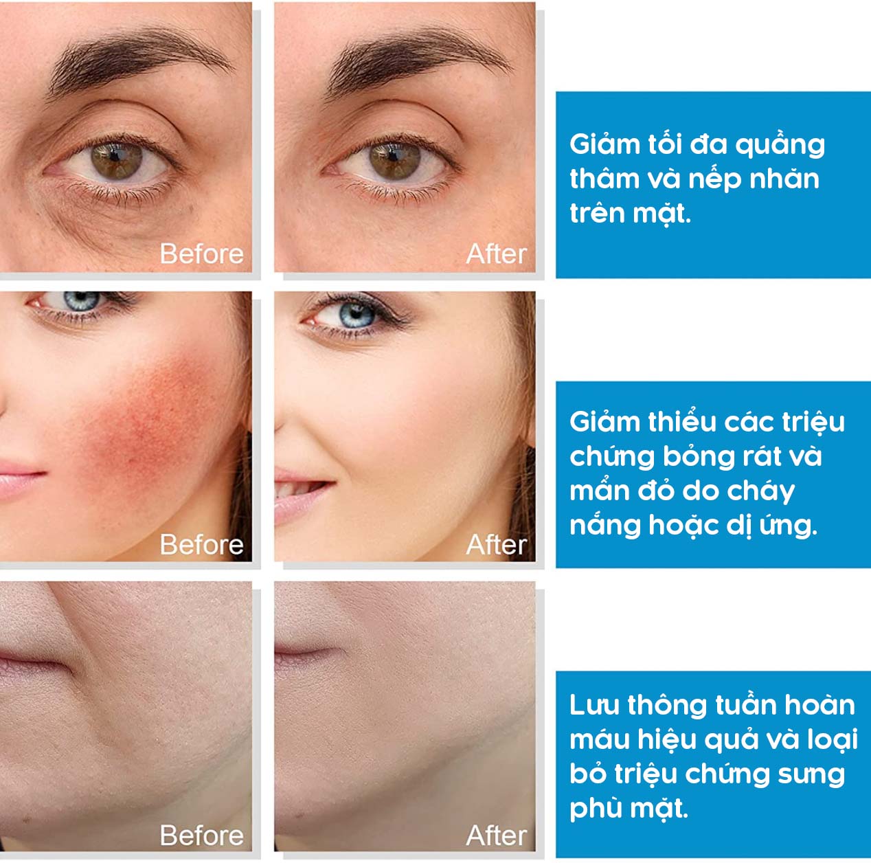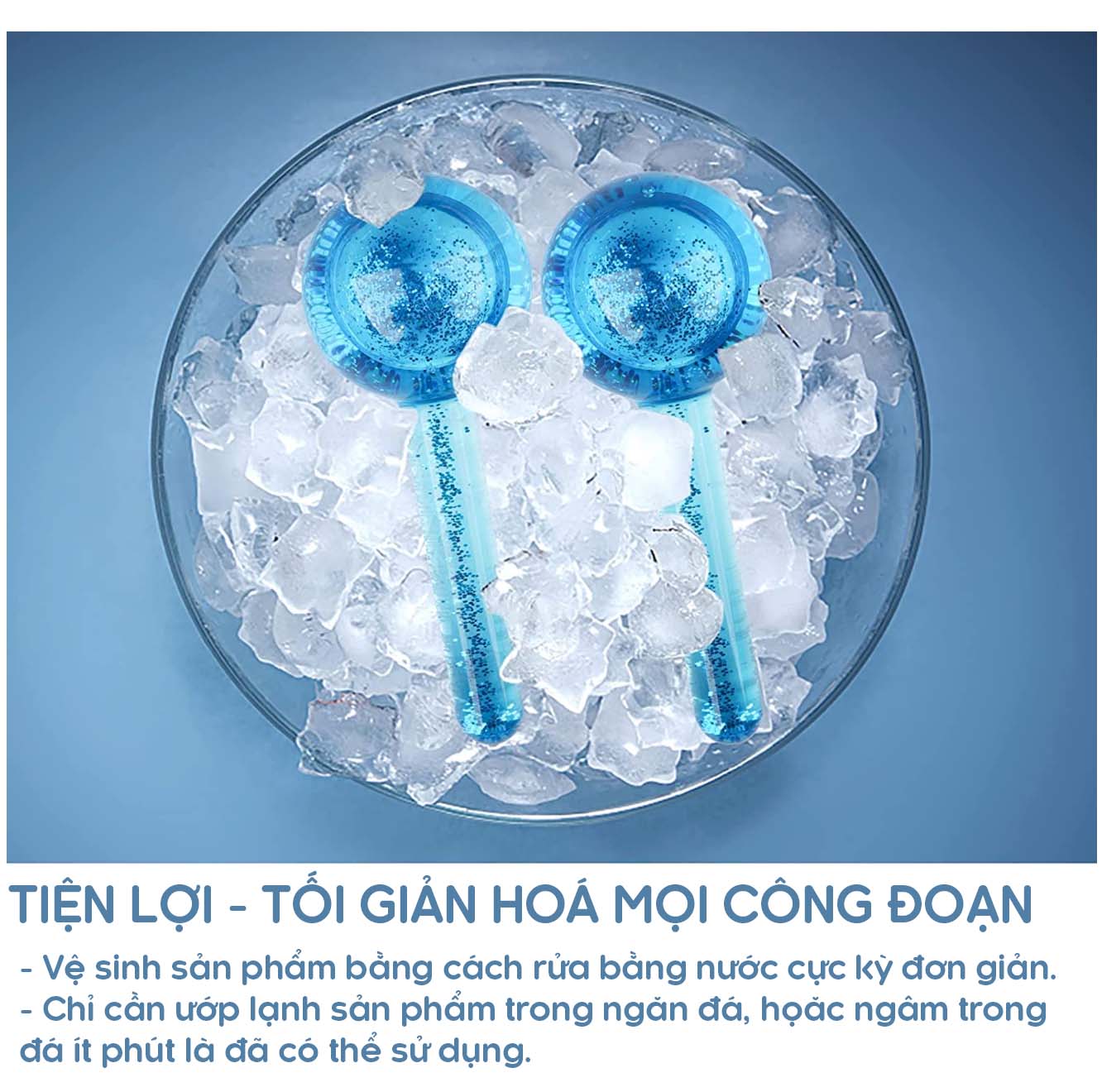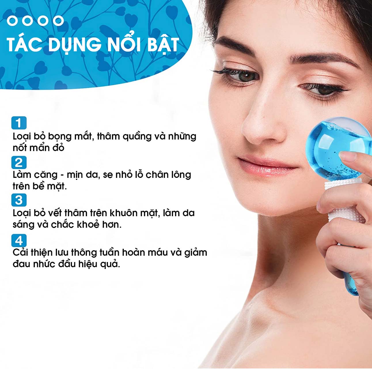 - GIÚP CHO LÀN DA TRẺ HƠN: Đảo ngược các dấu hiệu lão hóa với máy mát xa mặt bằng đá lạnh. Cải thiện độ đàn hồi của da, làm mờ các nếp nhăn nhỏ. Kích thích tuần hoàn máu và làm căng vùng da chùng nhão. Đẩy nhanh quá trình hấp thụ tinh chất. Góp phần vào việc sửa chữa và tái tạo các tế bào da và collagen. Quả cầu đá lạnh giúp giảm nếp nhăn và bọng mắt. Bạn sẽ có được làn da căng, săn chắc và trẻ trung hơn với làn da sáng khỏe. Sử dụng tốt hơn với serum, kem dưỡng, tinh dầu và mặt nạ.
