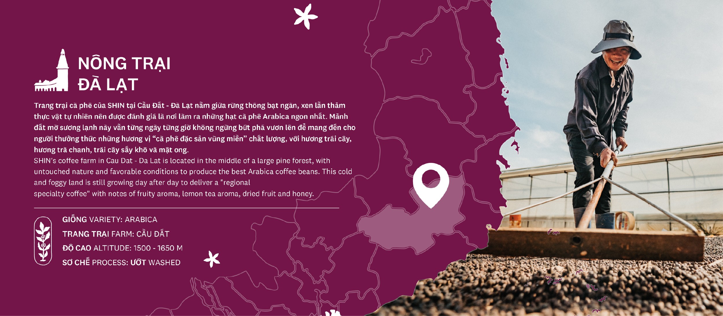 Đà Lạt với khí hậu mát lạnh quanh năm và những sườn đồi phủ đầy cà phê đã tạo nên một hương vị rất riêng – thanh, tươi và có chiều sâu. Người nông dân nơi đây làm cà phê như chăm một khu vườn – kiên nhẫn, tỉ mỉ từng bước – để từng hạt cà mang đúng hồn đất, vị trời. Cà phê Đà Lạt Blend của SHIN Cà Phê là nơi giao hòa giữa tự nhiên và bàn tay con người, mang lại hương vị đặc trưng rất riêng: trái chín, trái cây khô, chua thanh. Với SHIN Cà Phê, đây không chỉ là sản phẩm – mà là sự tiếp nối của một hành trình giữ gìn hương vị nguyên bản vùng miền Việt Nam.