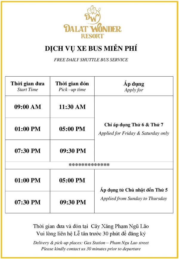 Lịch xe đưa đón miễn phí Resort - Trung tâm