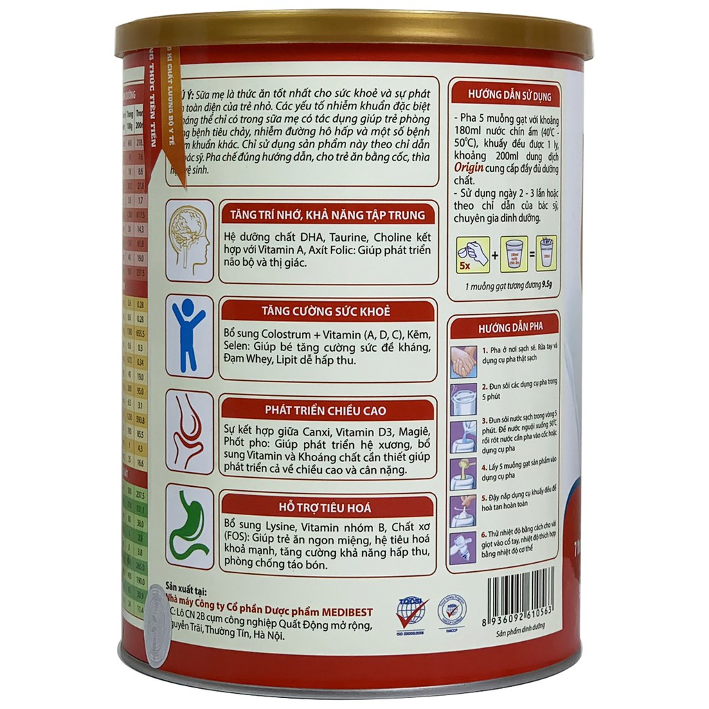 2. Sữa Origin 900g có tốt không, thành phần và công dụng + Với những bé trên 7 tháng tuổi mà có cân nặng và chiều cao chưa đạt tiêu chuẩn, các chuyên gia dinh dưỡng khuyên các mẹ nên bổ sung thêm sữa Origin cho bé. Sở dĩ dòng sữa Origin này được các chuyên gia khuyên dùng vì bổ sung vitamin và khoáng chất cần thiết nhất cho cơ thể như: Vitamin B1, vitamin B1, vitamin B5, vitamin A, Vitamin D, Vitamin E, Vitamin K, Natri và kali, Magie, Kẽm, Canxi, Sắt, Đồng và đặc biệt hơn sữa Origin có chứa protein đậu nành giúp cung cấp axit amin cần thiết cho sự phát triển của trẻ. + Giúp tăng trí nhớ, tăng khả năng tập trung: Nhờ trong sữa có hệ dưỡng chất DHA, Taurine, Choline kết hợp với Vitamin A, Axit Folic, hỗ trợ phát triển trí não và thị giác. + Giúp tăng cường sức khỏe: Trong sữa có bổ sung Colostrum, Vitamin (A, D, E, C), Kẽm, Selen giúp bé tăng cường sức đề kháng, đạm Whey và lipit giúp trẻ dễ hấp thu. + Giúp trẻ phát triển chiều cao: Sản phẩm với sự kết hợp giữa Canxi, Vitamin D3, Magie, Photpho giúp trẻ phát triển hệ xương, vitamin và khoáng chất cần thiết giúp phát triển cả về chiều cao và cân nặng. + Giúp hỗ trợ hệ tiêu hóa của trẻ: Trong sữa có bổ sung Lysine, Vitamin nhóm B, chất xơ (FOS) giúp trẻ ăn ngon miệng, hệ tiêu hóa khỏe mạnh, tăng cường khả năng hấp thụ, phòng chống táo bón.