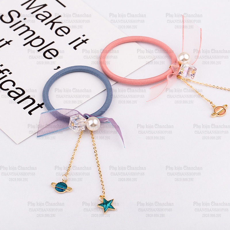 Chất liệu: thun cột tóc bạc, hạt pha lê, huy hiệu hợp kim, ruy băng ren