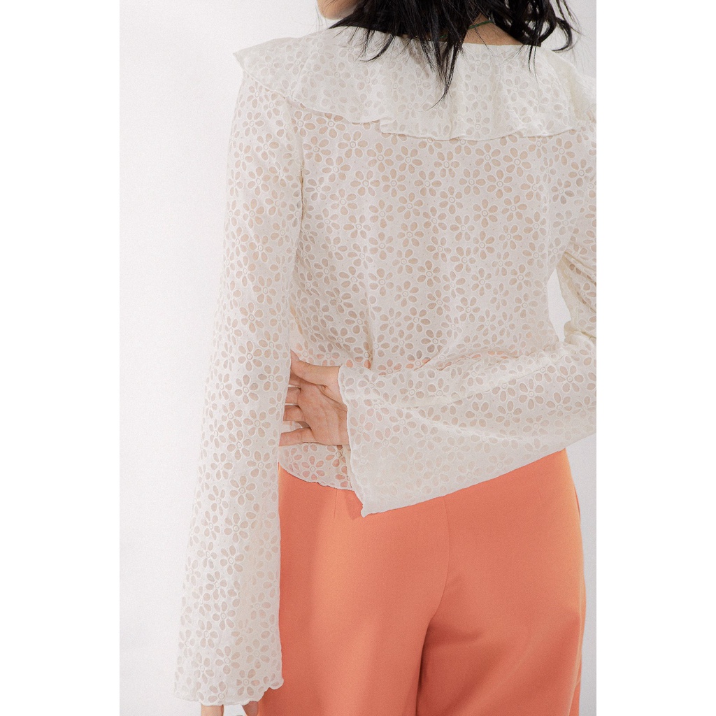 Giới thiệu LIBÉ - Áo kiểu tay dài dáng suông cổ tròn phối bèo trên nền vải thêu hoa màu trắng