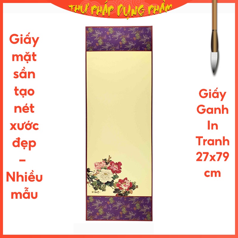 Giấy viết thư pháp, liễn thư pháp in tranh được làm từ chất liệu GIẤY GANH, kích thước phủ bì 27x79cm. Dòng giấy in tranh này có thể nói là đã quá quen thuộc với các ông đồ rồi. Đối với thư hữu chưa từng sử dụng loại giấy này thì có thể yên tâm về chất lượng của sản phẩm nhé. Giấy in tranh sắc nét, dày dặn, khi treo lên sẽ phẳng phiu, không bị quăn. Đây có lẽ là mẫu giấy viết thư pháp giá rẻ và thông dụng nhất ở Việt Nam. Quý thư hữu sau khi viết sẽ luồn nẹp treo (hay còn gọi là ống sáo) vào giấy rất dễ dàng, tiện dụng nhé.