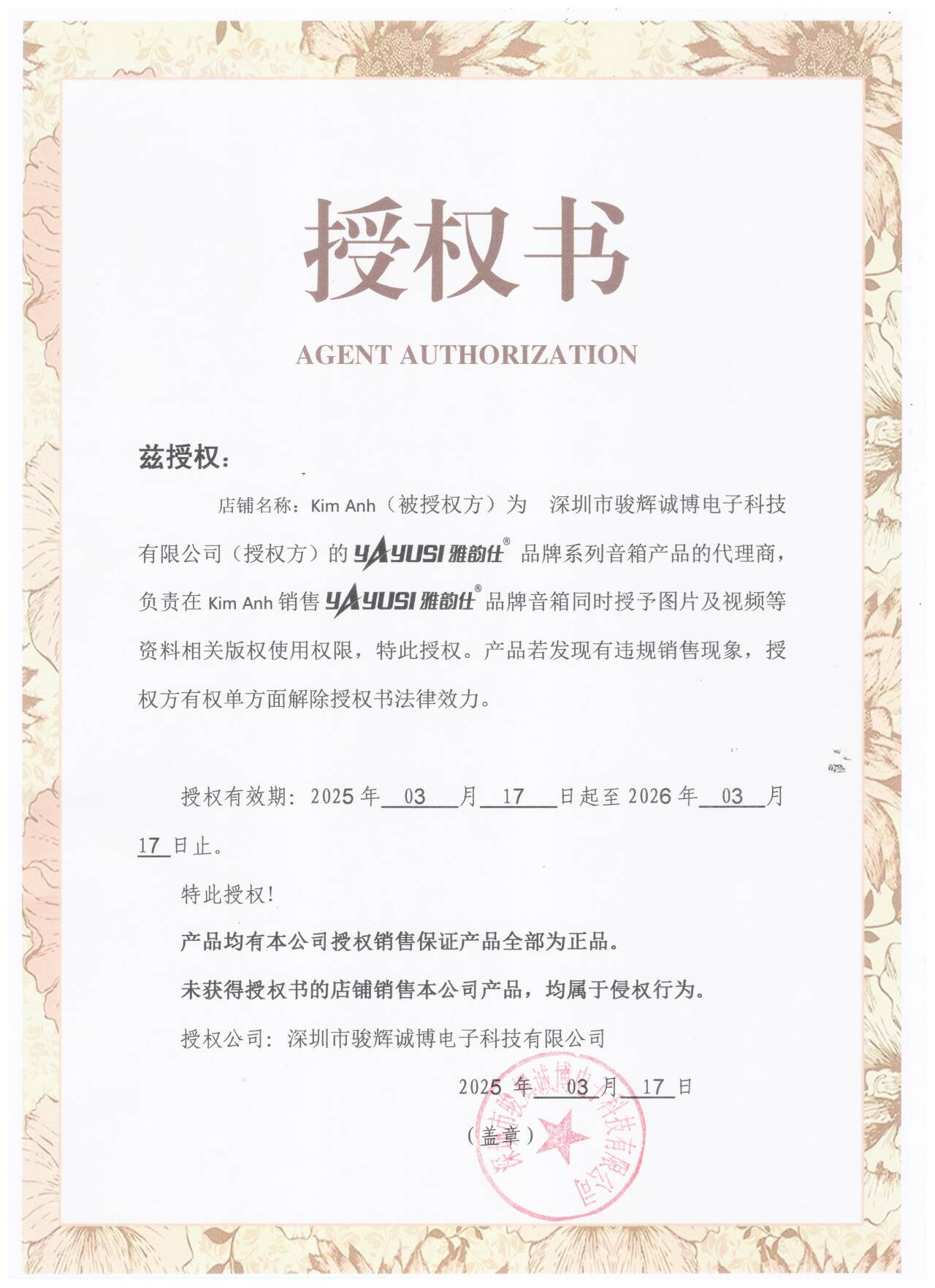 Cam kết hàng chính hãng sai 1 đền 100, do Kim Ánh nhập trực tiếp về ( có giấy uỷ quyền nhà máy YAYUSI cấp cho Kim Ánh)