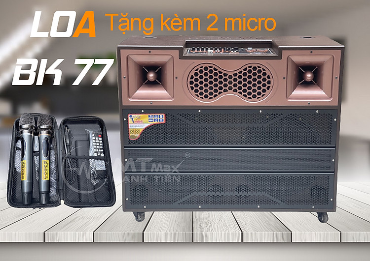 Loa kéo di động MTMax BK77 - Dàn karaoke ngoài trời bass 4 tấc đôi ngang, 2 treble - Loa khủng long công suất cực lớn đến 6000W - Kèm 2 micro không dây UHF - Đầy đủ kết nối Bluetooth, AV, USB, SD card, TWS - Thùng gỗ cao cấp cho âm thanh mạnh mẽ, chân thực