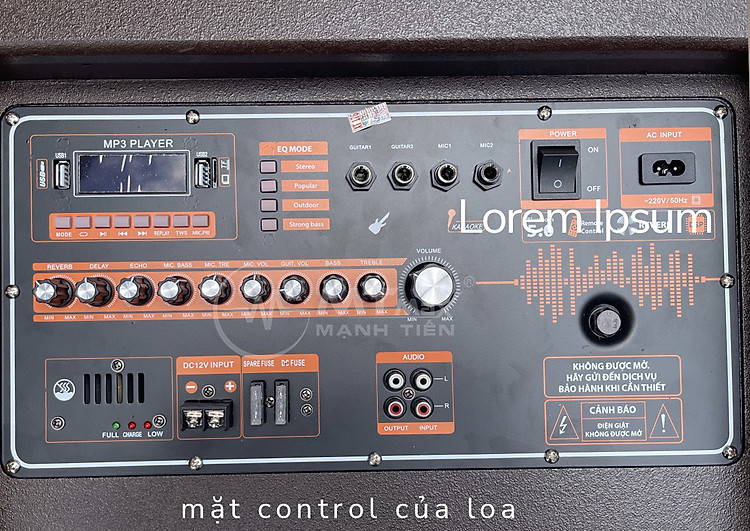 Bên trên mặt loa là bảng mạch chứa các nút vặn và các cổng kết nối rất dể dàng sử dụng. Hai tay micro không dây được trang bị thêm có chỗ để gọn gàng, sử dụng dễ dàng, chất lượng.