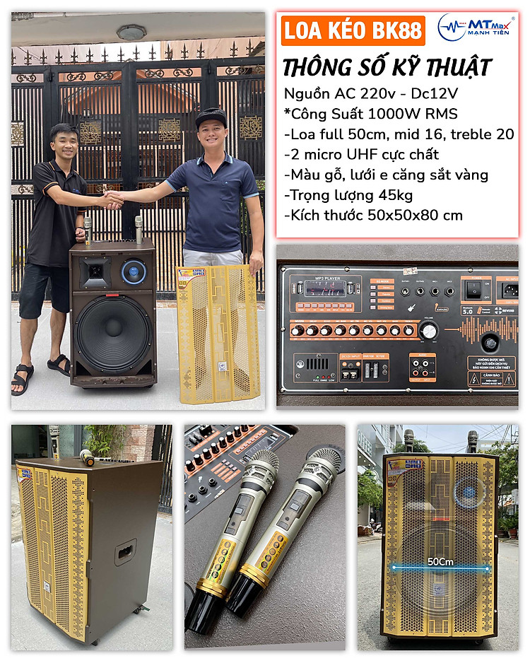Loa kéo di động MTMax BK88 - Dàn karaoke ngoài trời bass 5 tấc 1 mid 1 treble - Loa khủng long công suất theo nhà sản xuất đến 1000W - Kèm 2 micro không dây UHF - Đầy đủ kết nối Bluetooth, AV, USB, SD card, TWS - Thùng gỗ cao cấp cho âm thanh mạnh mẽ, chân thực