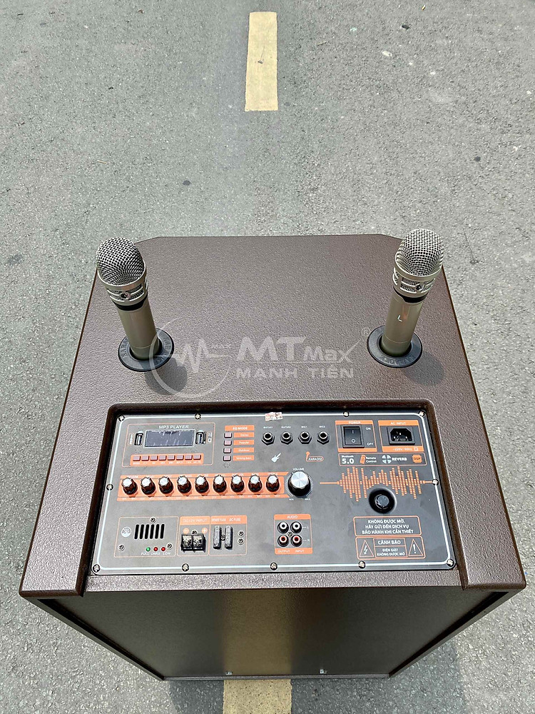 Bên trên mặt loa là bảng mạch chứa các nút vặn và các cổng kết nối rất dể dàng sử dụng. Hai tay micro không dây được trang bị thêm có chỗ để gọn gàng, sử dụng dễ dàng, chất lượng.