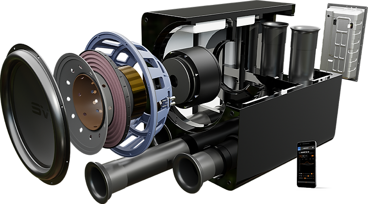 - Việc phối hợp hệ sinh thái bộ khuếch đại, động cơ và củ loa tiên tiến là DSP phức tạp nhất từng được triển khai trong loa siêu trầm tiêu dùng.