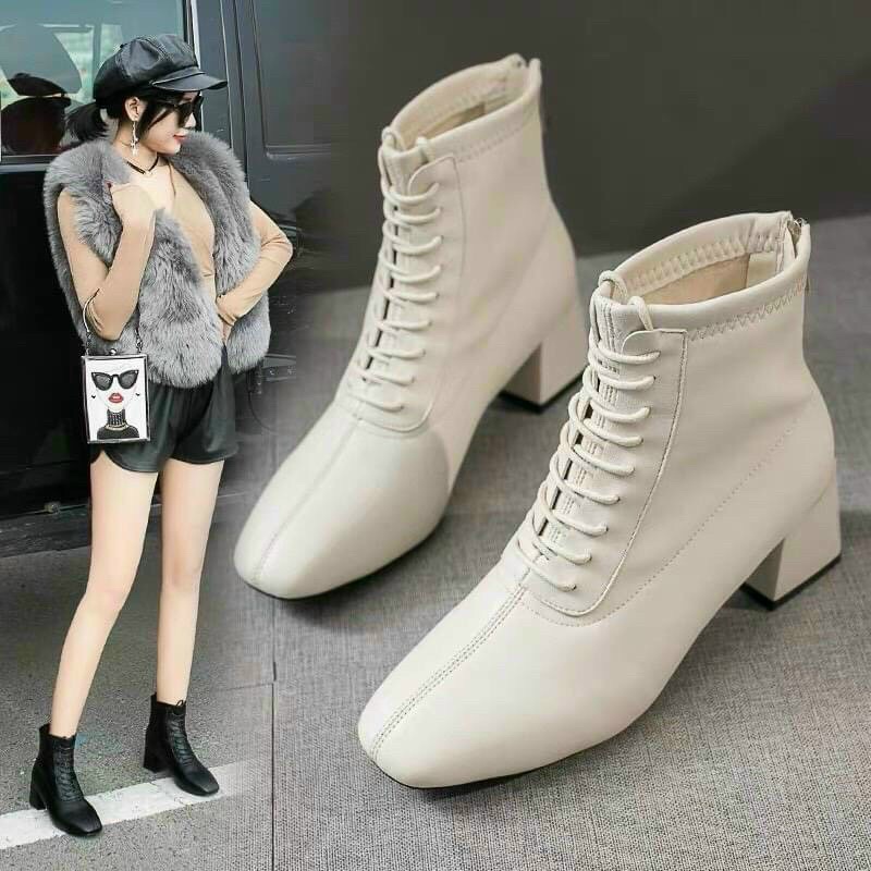 Giới thiệu [ Loai 1 ] bốt nữ da lì 5p,bốt nữ 5p,bốt buộc dây gót vuông 5p, bốt đan dây kéo khoá cao cấp, 2 màu đen - kem hàng vnxk