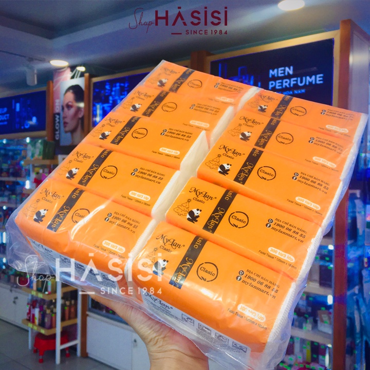 Mục đích sử dụng: Dùng để lau sạch da mặt, lau tay và các bề mặt, vật dụng tiếp xúc trực tiếp với da hàng ngày. Đóng gói: 10 gói/xách (300 tờ/3 lớp/gói). Kích thước mỗi tờ giấy: 120mm x 180mm. Chất liệu: 100% bột gỗ thông nguyên chất. Sản xuất tại: Công ty TNHH giấy MyLan.