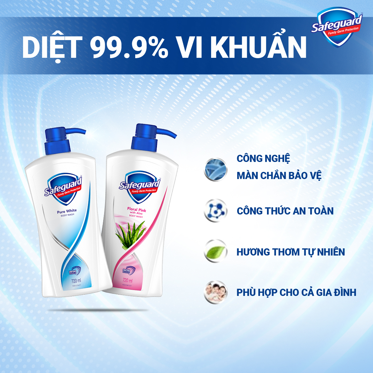 - Safeguard giúp bạn bảo vệ sức khỏe gia đình và cuộc sống một cách trọn vẹn nhất bằng cách ngăn ngừa những vi khuẩn gây hại tấn công gia đình bạn.